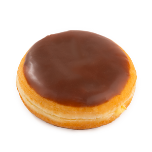 Round donut coated with iced chocolate and filled with Custard cream